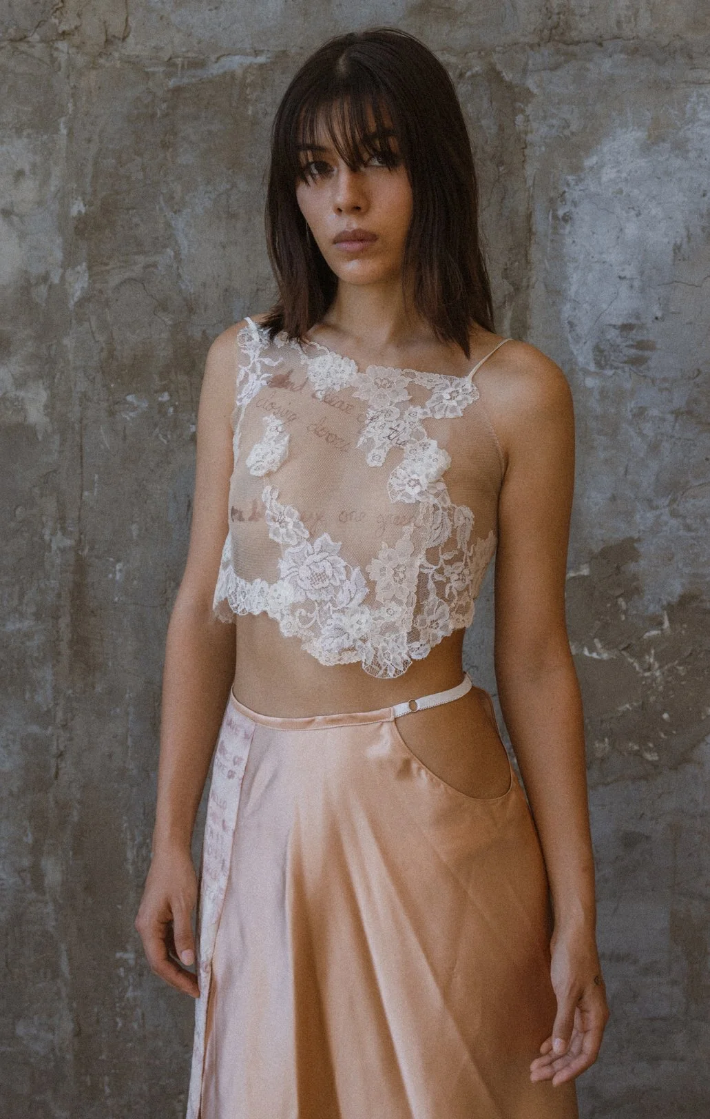 Tulle painted with text inspired by my grandmother, and a day spent thinking of her. Hand cut appliquéd lace, vintage satin straps